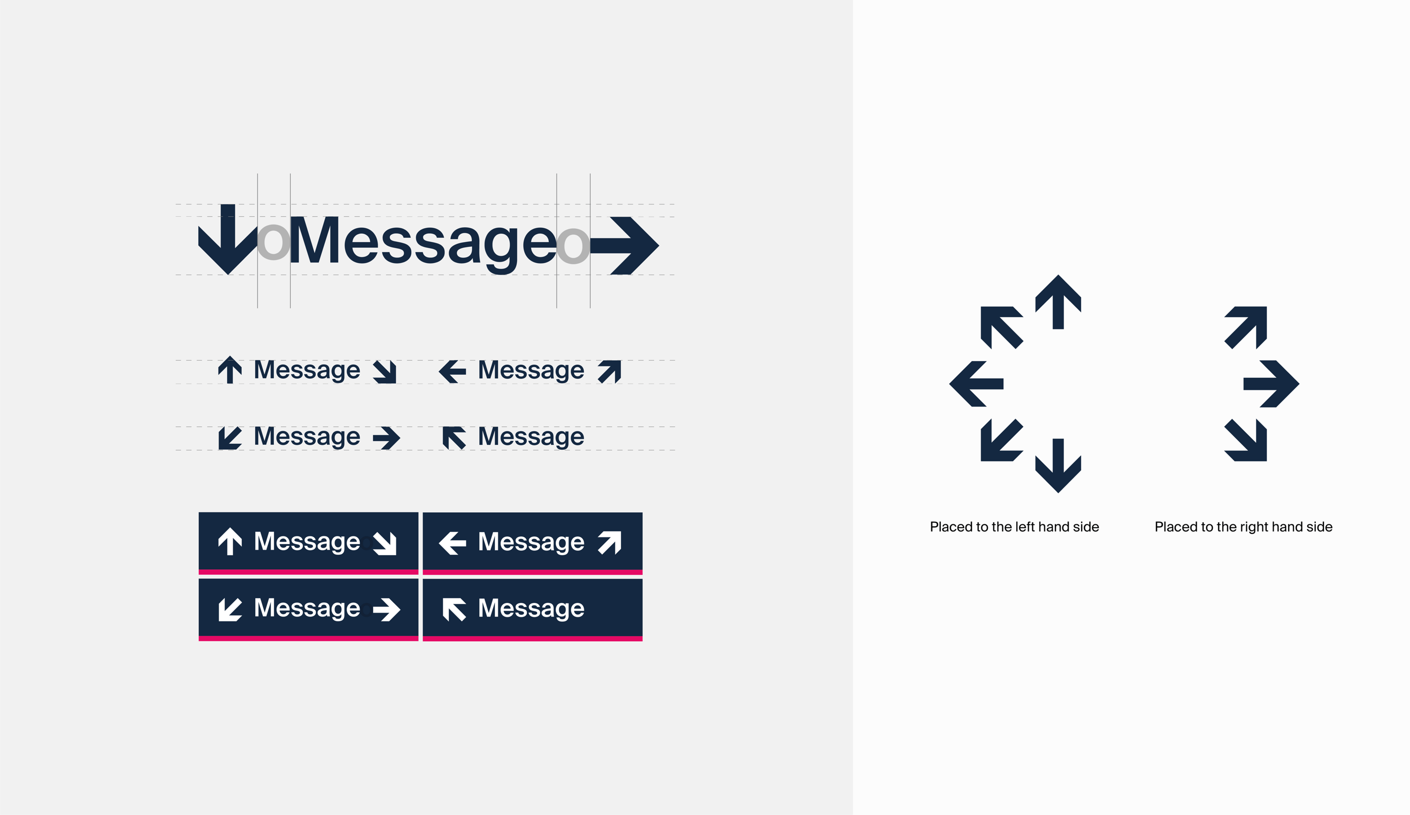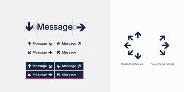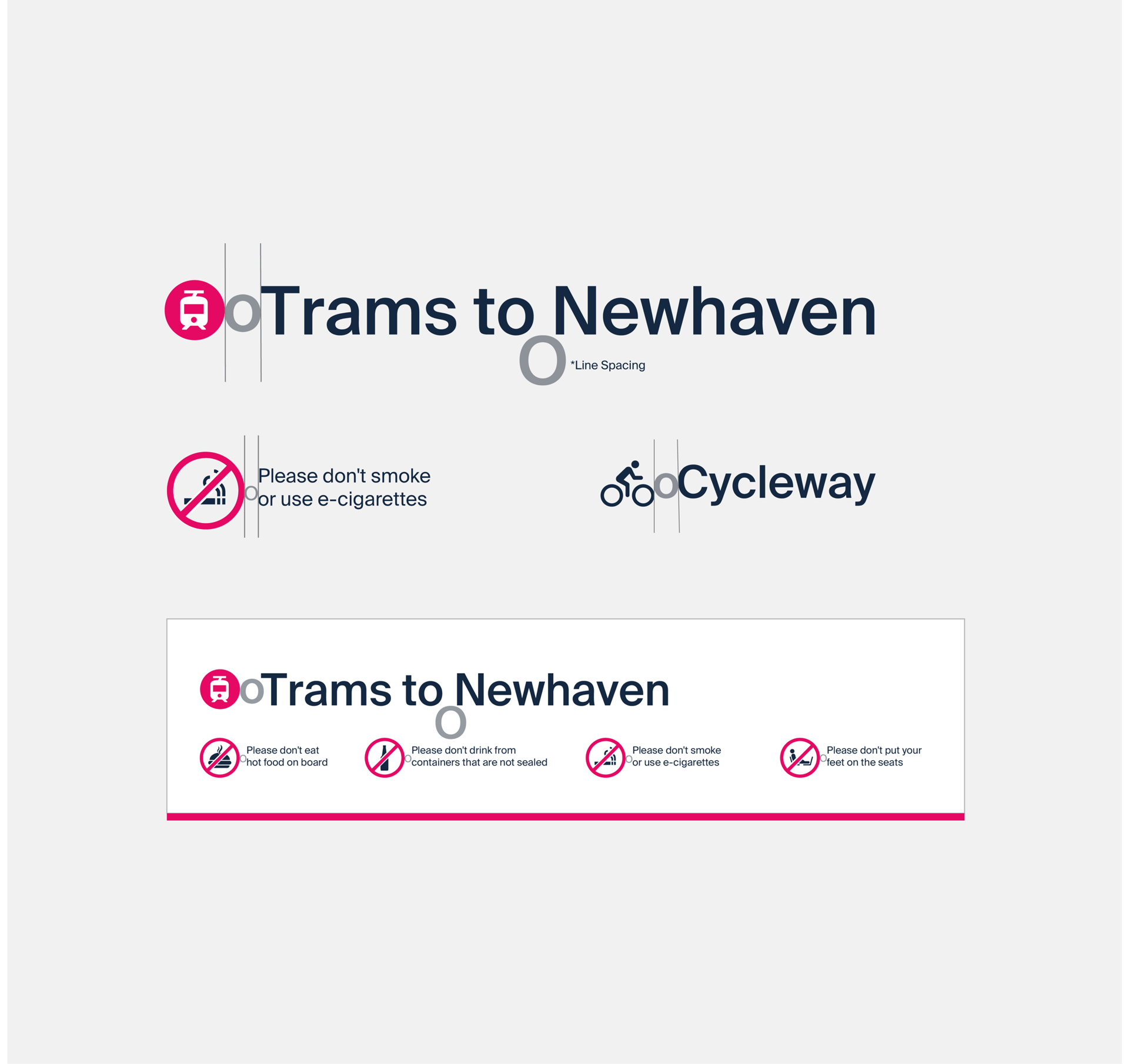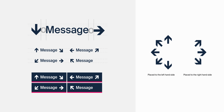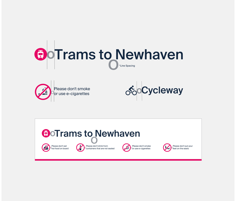 The Edinburgh Trams have 8 directional arrows and must not be altered. Arrows indicating direction to the left, straight ahead or down should be placed on the left hand side of the text. Arrows indicating direction to the right should be placed at the right hand side of the text. Sign messages should be ranged left to right according to the direction indicated by the arrow. The space between the arrow and the text is equivalent to the lower case ‘o’ of the text.
