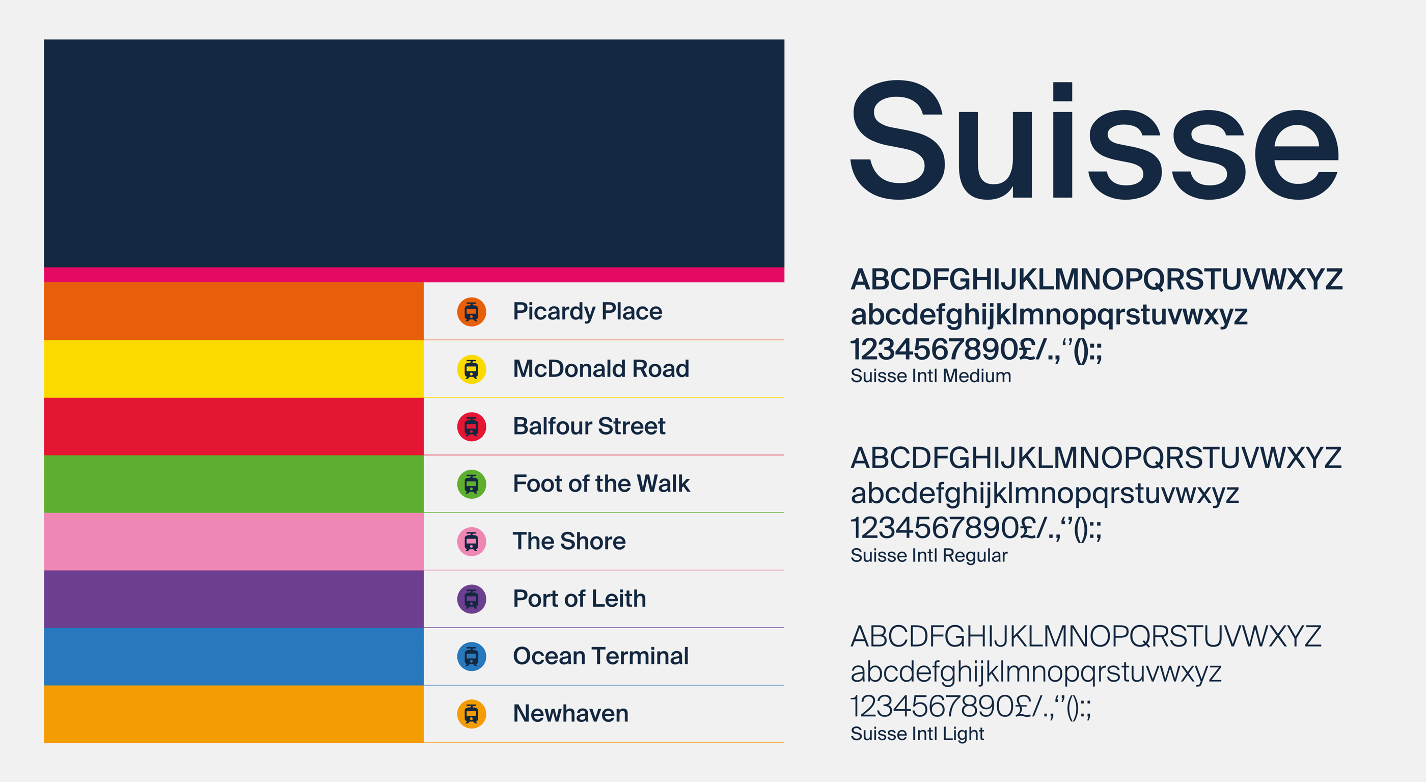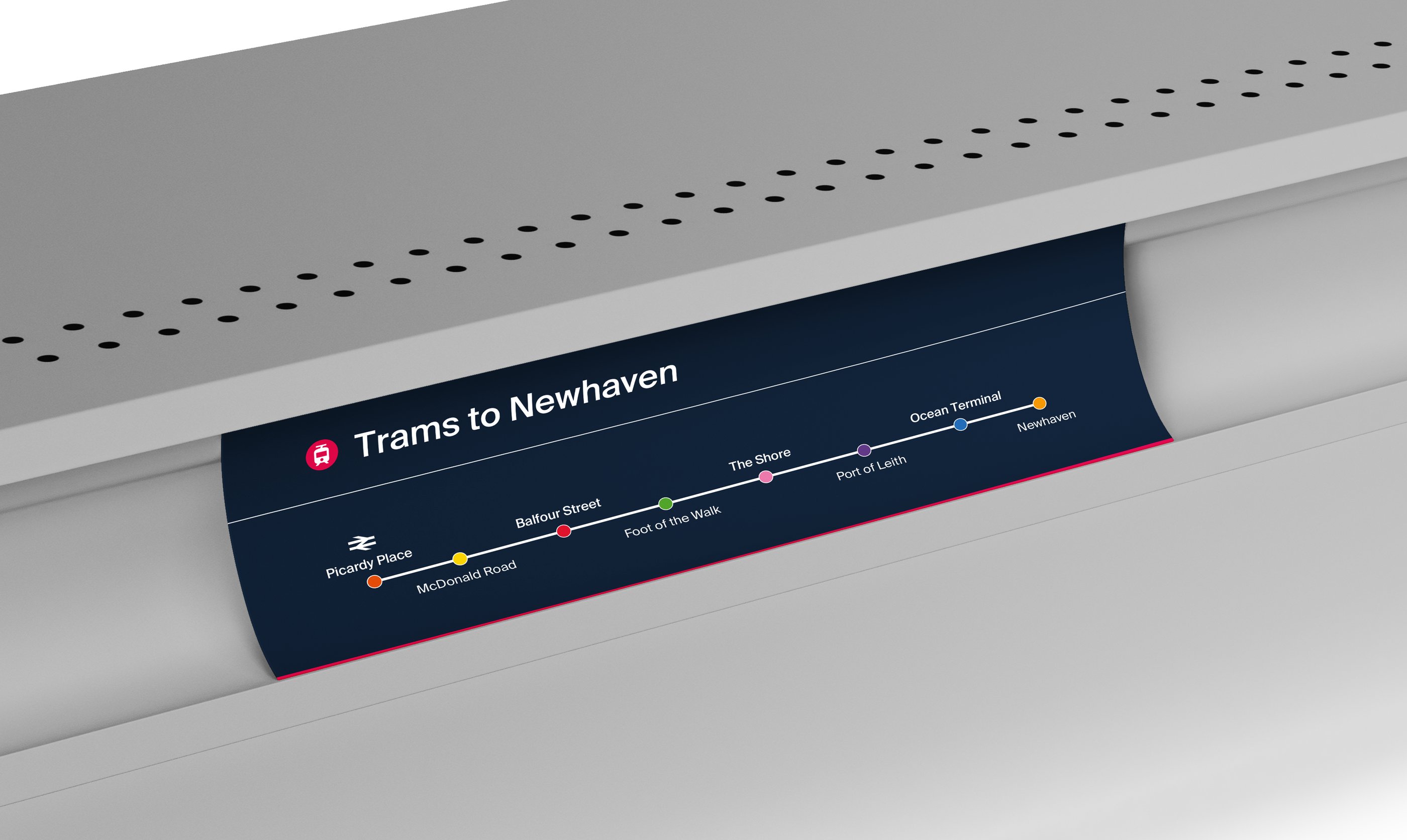 The brand colours for Edinburgh Trams for both digital and print designs are blue and pink, but there are other colours which are to be used when producing tram signages. Each tram stop is colour coded to have a recognisable identity and can be easily remembered.