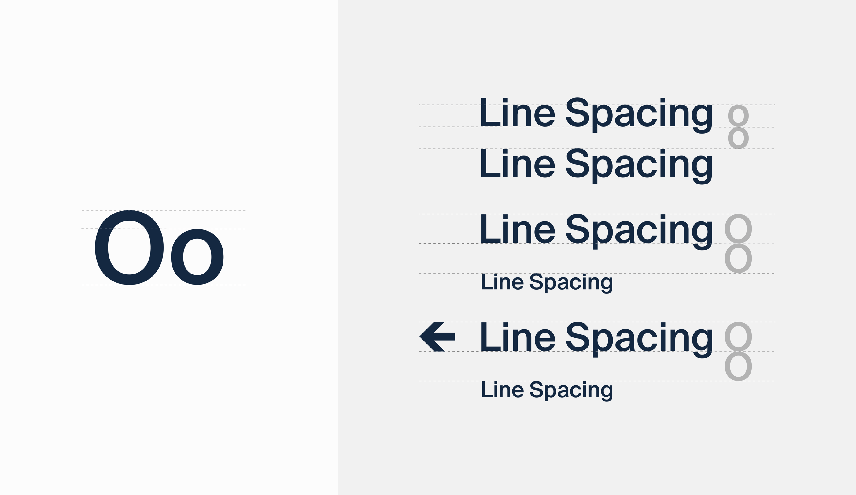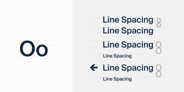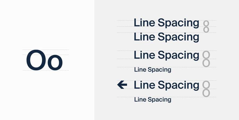 Line spacing is equivalent to the height of the lower case letter ‘o’. When the information is more than one size, the larger ‘O’ height should be used to separate the two lines.
