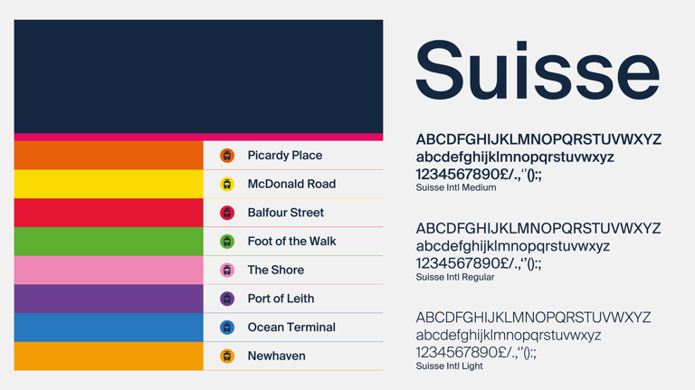 Suisse Intl Medium is Edinburgh Trams’ and Glide App brand typeface and is used for all digital design, signing within the passenger environment, and for a wide range of publicity and other material. It is highly legible and yet ‘friendly’ in tone. The lettering must be shown in upper and lower case not just capitals only. This is to enhance readability when text statements are longer than one word.